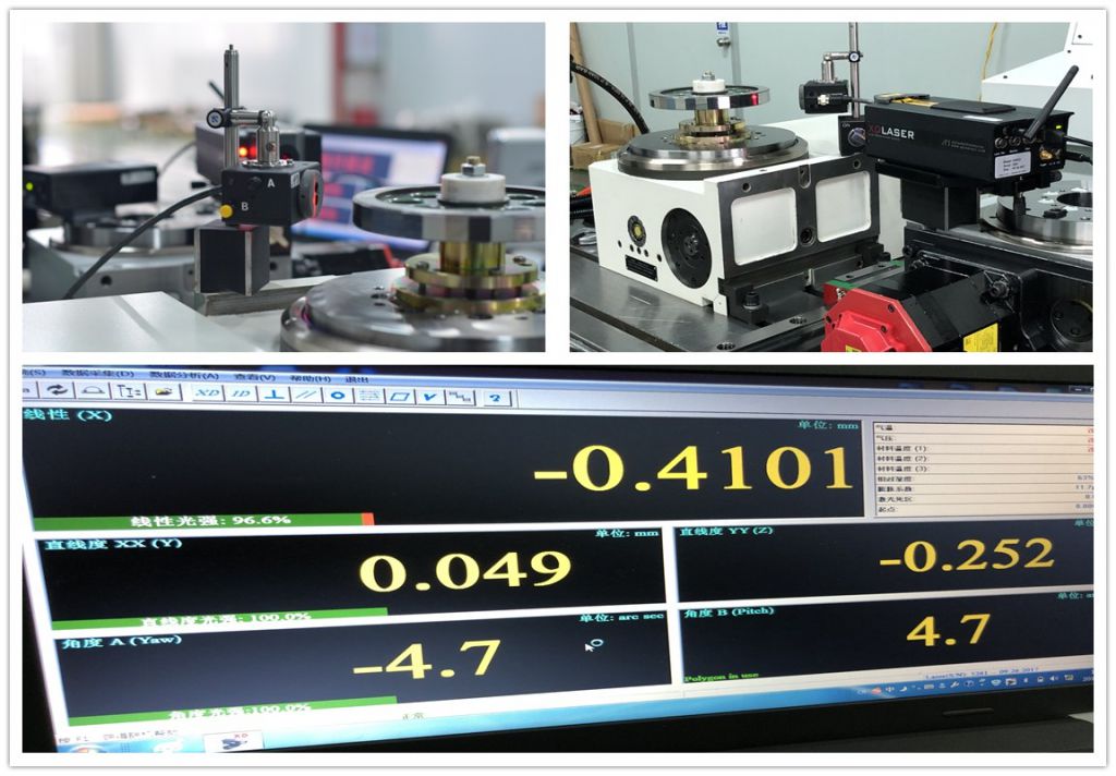 成品質(zhì)量控制(OQC):我們對成品轉(zhuǎn)臺實行全檢,符合國標GB/T 17421.2-2016/ISO230-2:2006 機床檢驗通則(數(shù)控軸線的定位精度和重復定位精度的確定), 采用最先進的CNC機床模擬測試儀,可測試各種操作系統(tǒng)(包括發(fā)那科、西門子、三菱、海德漢、發(fā)格、兄弟等, 也包括華大、華中、廣數(shù)等國產(chǎn)系統(tǒng))下沃迪士轉(zhuǎn)臺的工作狀態(tài)。轉(zhuǎn)臺精度測試均采用鐳射等精密儀器。