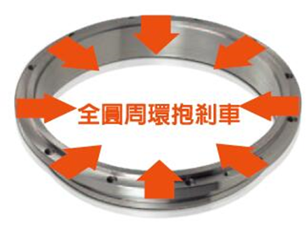目前數控轉臺的剎車從結構上分主要是環抱式剎車系統、碟片式剎車系統、下面是各種結構的特點介紹。 (一).環抱式剎車系統 環抱式剎車環安裝在出力軸上,通過液壓壓力使剎車面變形,接觸面積大。 (二).碟片式剎車系統 碟片式剎車片安裝在出力軸尾端,通過氣壓剎車后,剎車片緊貼箱體。
